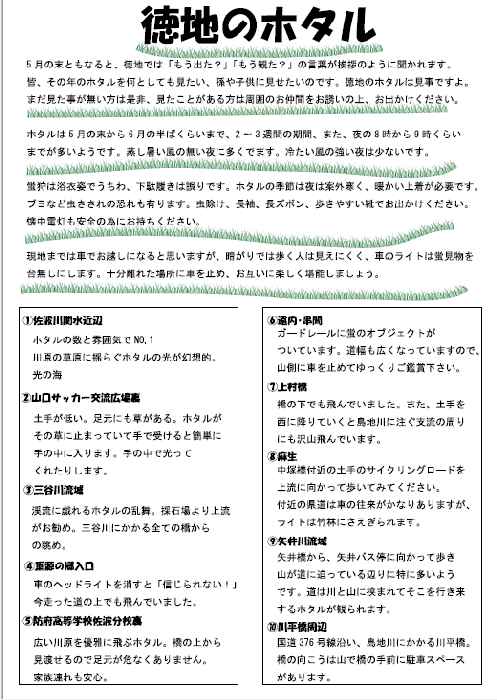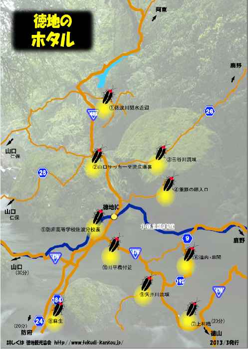(①佐波川関水近辺 ,②山口サッカー交流広場) ,③三谷川流域 ,④重源の郷入り口 ,⑤防府高校佐波分校裏 ,⑥遠内・串間 ,⑦上村橋 ,⑧麻生 ,⑨矢井川流域 ,⑩川平橋周辺)